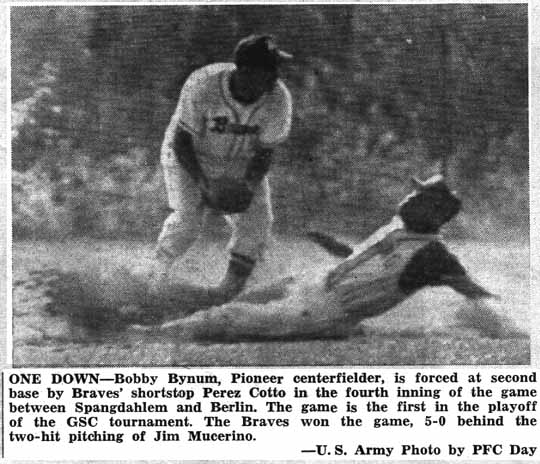 Tonight the Bears leave Berlin for Kitzingen, were they will play a weekend series with the Kolts, champions of the Marne League. These two teams have not met previously this season, but they may clash in the USAREUR playoff, which begin August 16. The Bears will square off against the 2nd Brigade team of the 3rd Armored division League Friday August 16, in Frankfurt. The team returns to Berlin for the second game of the opening round Sunday. If a third game is required, it will be played as the second game of a doubleheader, Sunday.