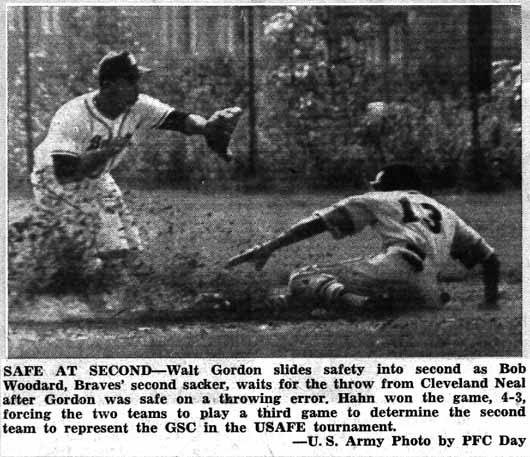 Tonight the Bears leave Berlin for Kitzingen, were they will play a weekend series with the Kolts, champions of the Marne League. These two teams have not met previously this season, but they may clash in the USAREUR playoff, which begin August 16. The Bears will square off against the 2nd Brigade team of the 3rd Armored division League Friday August 16, in Frankfurt. The team returns to Berlin for the second game of the opening round Sunday. If a third game is required, it will be played as the second game of a doubleheader, Sunday.