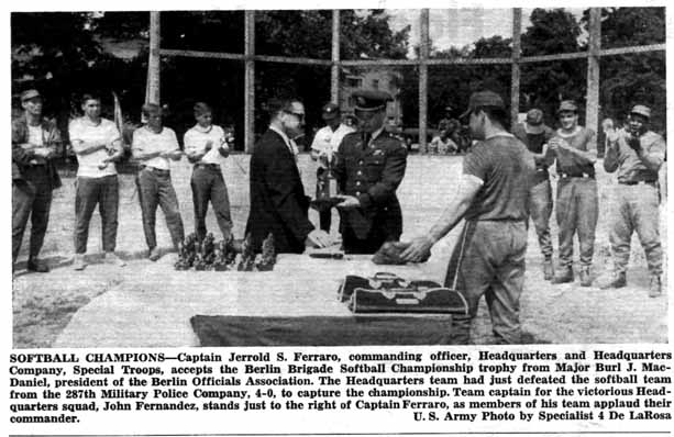 Immediately after the championship game, Major Burl J. McDaniel, president of the Berlin Officials Association, presented trophies and athletic bags to the two top teams, and presented the Berlin Brigade Softball Championship trophy to Captain Jerrold S. Ferraro, commanding officer, Headquarters and Headquarters Company, Special Troops. Headquarters Company is now in contention for first in the point race for the Commanding General’s Trophy, which is awarded annually to the company that posts the best overall intramural sports record.